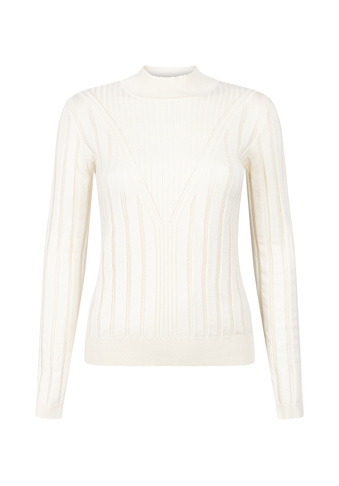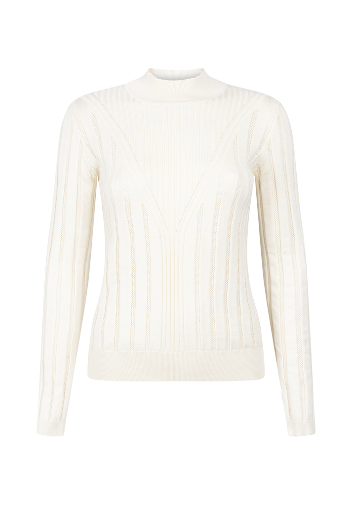 The Vida Sweater is a sleek and sophisticated knit with a contemporary edge. Its fitted silhouette is brought to life by an asymmetrical ribbed pattern that adds shape and dimension. Designed with a high round neckline and long sleeves, it is perfect for layering or making a statement on its own. Style it with the Quinn trousers for a polished, modern look.
